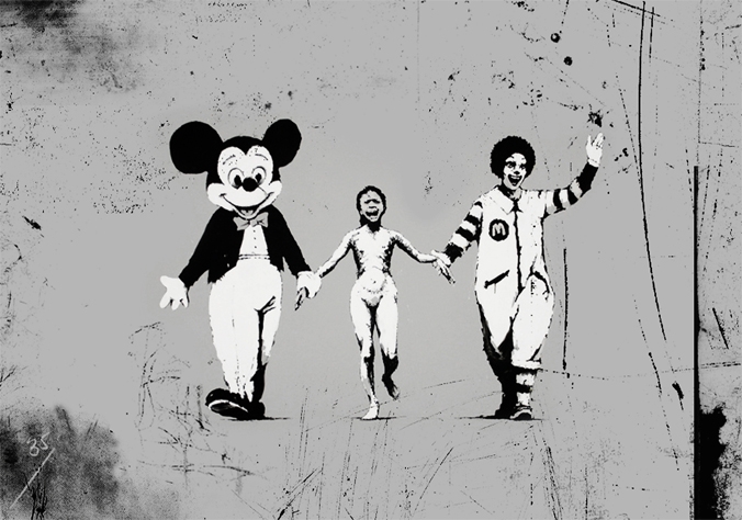 Napalm Girl with Mickey & Ronald McDonald: This satirical work is an attack on the consumerism that occupies the attention of the American people and keeps them blind to the way their foreign policy is conducted. It also points to how consumerism keeps the population blind to more pressing concerns generally. History provides numerous examples of populations that have been pacified with entertainment to distract them from social injustices. Banksy also invites the observer to ponder the commercialization of war itself, which is now a multi-billion dollar industry with very powerful corporate lobbies. Peace, love and empathy for fellow human beings are the sustenance of life, and these things cannot be bought.